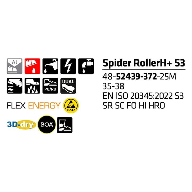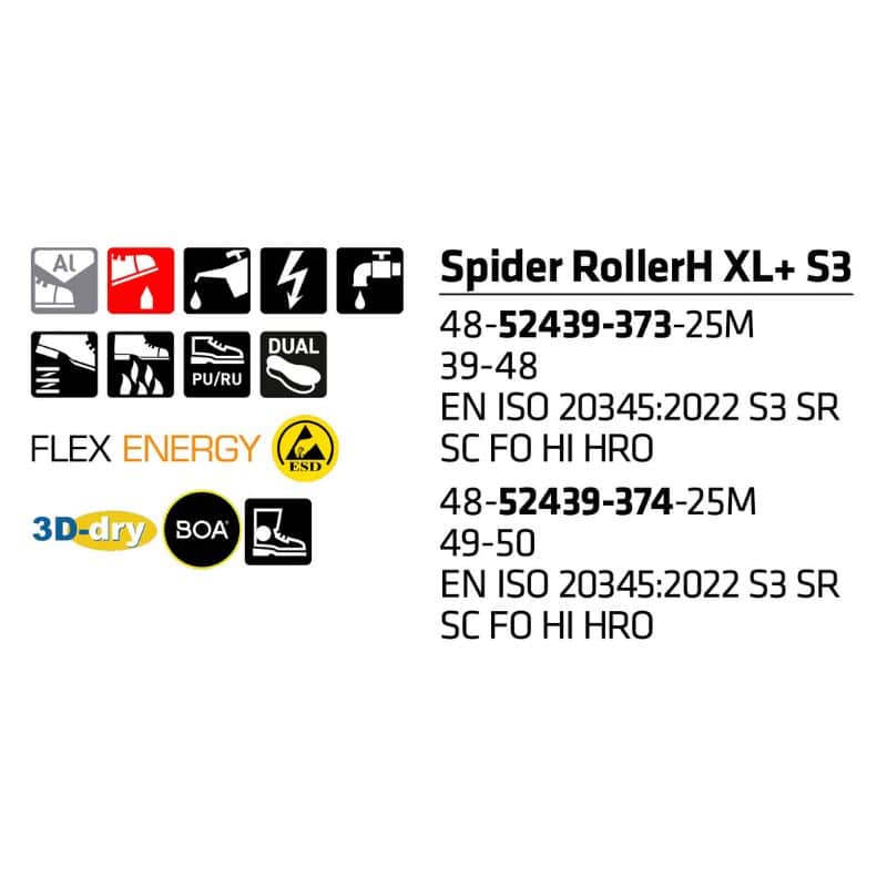 3D-dry-vuoren ansiosta jalkasi pysyvät kuivina ja saavat hengittää tehokkaasti, sillä Sievin kehittämä 3D-dry-vuori siirtää kosteutta tehokkaasti jalan pinnalta pois vuorimateriaalin ja päällisrakenteen kautta pois kengästä. Spider RollerH XL+ S3 -kengissä on innovatiivinen FlexEnergy-kantavaimennus, joka palauttaa jopa 55 % liike-energaa takaisin askellukseen. Tämä vähentää jalkoihin kohdistuvaa rasitusta huomattavasti ja pitää huolta siitä, että askel pysyy kevyenä pitkänkin päivän jälkeen. DUAL Comfort pohjallinen lisää mukavuutta entisestään muun muassa kantaosan ja päkiän PORON®-iskuvaimennustyynyillään.